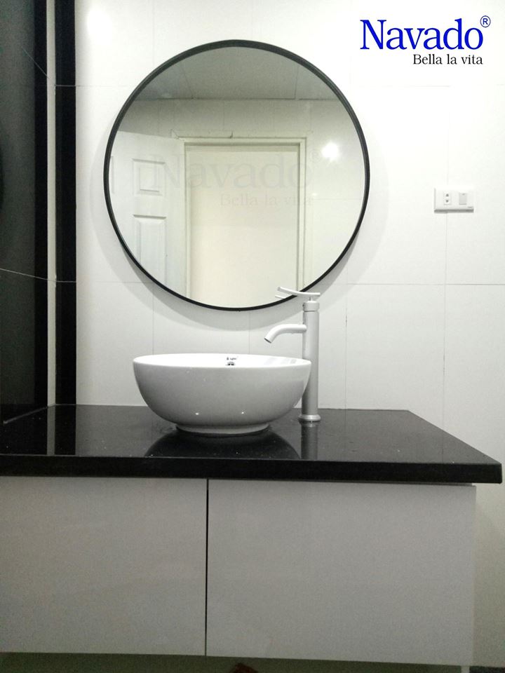Một chiếc gương tròn cá tính ngay phía trên bồn rửa mặt mang đến sự cá tinh và độc đáo cho phòng tắm