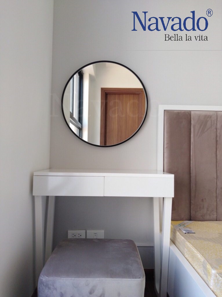 Phong cách tối giản khá phù hợp với những căn phòng nhỏ hoặc trong một không gian quá nhiều vật dụng trang trí cầu kỳ, rối mắt. Với phòng ngủ nhỏ, hạn chế vật dụng trang trí, hạn chế màu sắc cũng như đường nét của nội thất là phương pháp tối ưu nhất giúp mọi thứ gọn gàng, ngăn nắp. Những lúc như này, những chiếc gương tròn đơn giản đủ để mang đến vẻ đẹp hiện đại, khoáng đạt cho căn phòng. Tuy đơn giản nhưng gương vẫn ở trong danh sách những mẫu gương bàn trang điểm hiện đại nổi bật bởi viền gương được thiết kế chăm chút tỉ mỉ từng chi tiết, đường nét tạo nên vẻ đẹp riêng có. Không gian rộng hơn bạn vẫn hoàn toàn có thể sử dụng phong cách gương này nếu yêu thích, chỉ cần chú ý chọn những vật trang trí khác phù hợp, hài hòa thẩm mỹ nhà bạn là được.