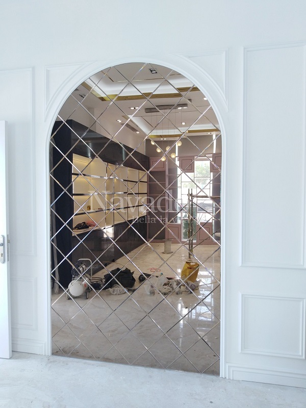 Gương ghép tường nghệ thuật là kiểu ghép tự do đòi hỏi bạn phải lên ý tưởng, hình dáng phù hợp với phòng khách trước, rồi yêu cầu thợ thi công riêng. Yêu cầu cao hơn so với những loại gương thông thường nhưng chắc chắn sự độc đáo đến từ kiểu gương này sẽ mang đến cho phòng khách nhà bạn sự cao cấp và nghệ thuật riêng biệt.