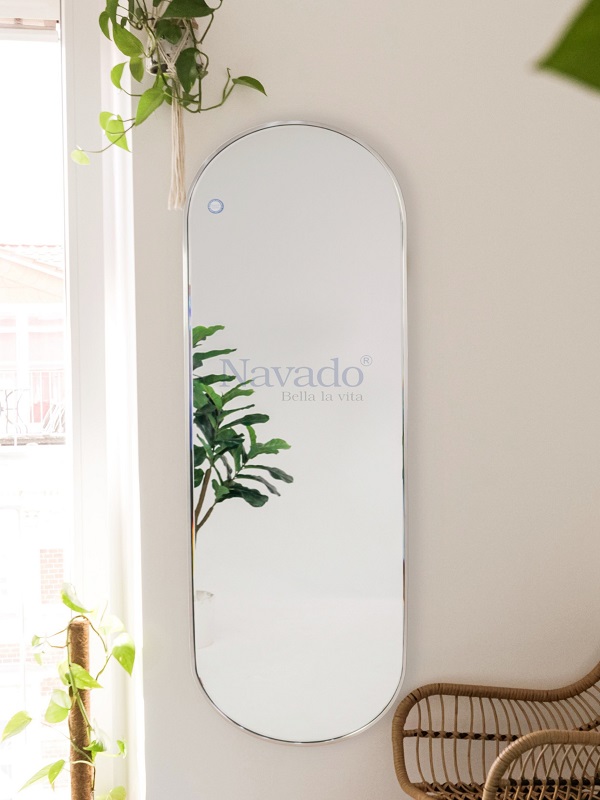 Gương soi toàn thân tạo hình bo 2 đầu với đường nét đơn giản, khỏe khoắn khiến cho người sử dụng cảm thấy tinh thần luôn phấn khởi. Hơn nữa, gương mang đến khung inox màu bạc bản hộp 1:2 chắc chắn. Màu trắng chủ đạo của khung viền phù hợp với các mẫu căn nhà có thiết kế tối giản, hiện đại.